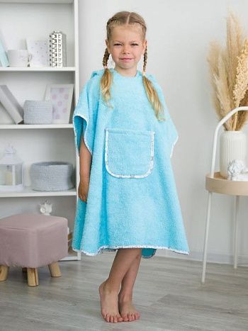 Пончо имеют стандартный размер 60 х 120 см. Накидка с капюшоном подходит для детей дошкольного возраста. Модели различаются разнообразной окраской, среди которых преобладают пастельные оттенки. Многие из них украшены нежной вышивкой. Основное предназначение пончо – накидывание на ребенка после купания. Одежда легко надевается через голову. Отсутствие застежек и завязок открывает простор для движений. Дети могут резвиться после купания, а капюшон защищает от сквозняков и переохлаждения.