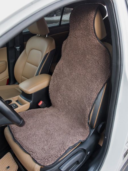 Меховая накидка на кресло автомобиля коричневая, с накладкой на подголовник