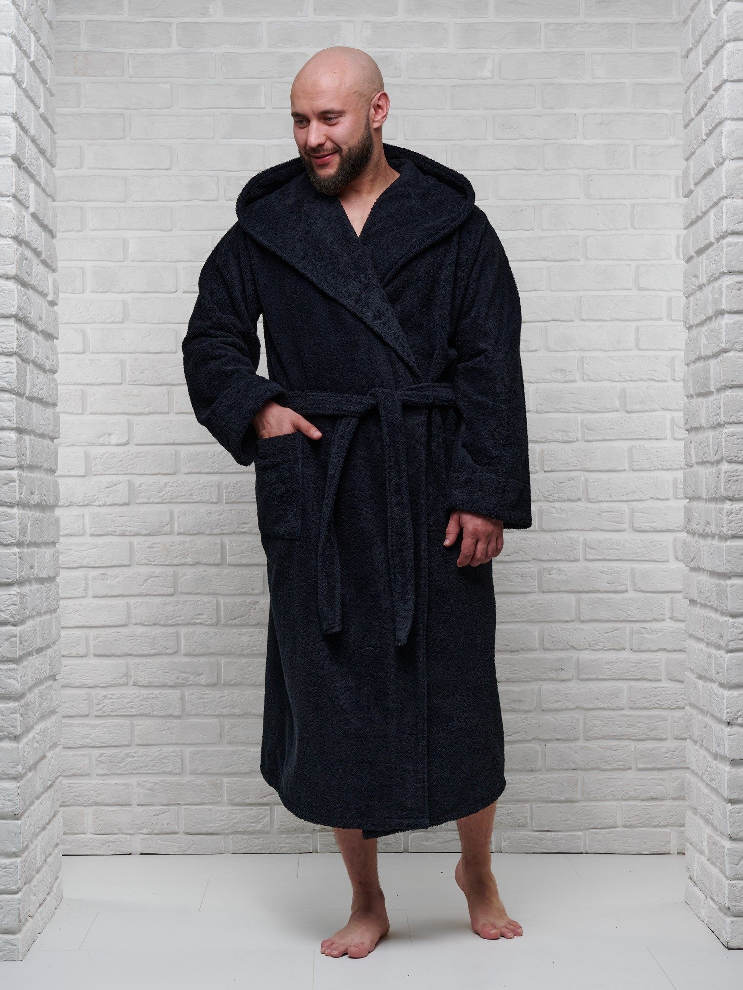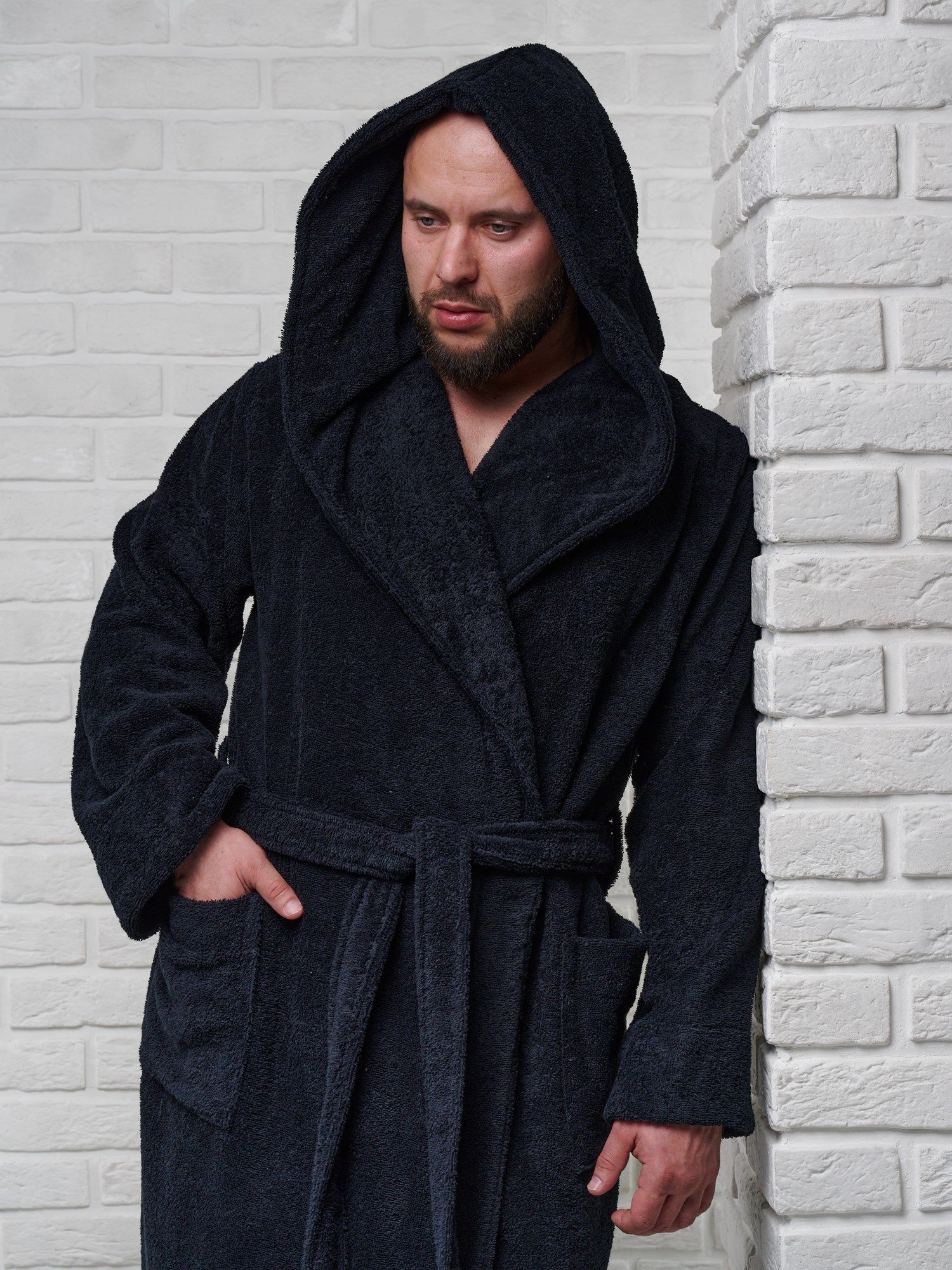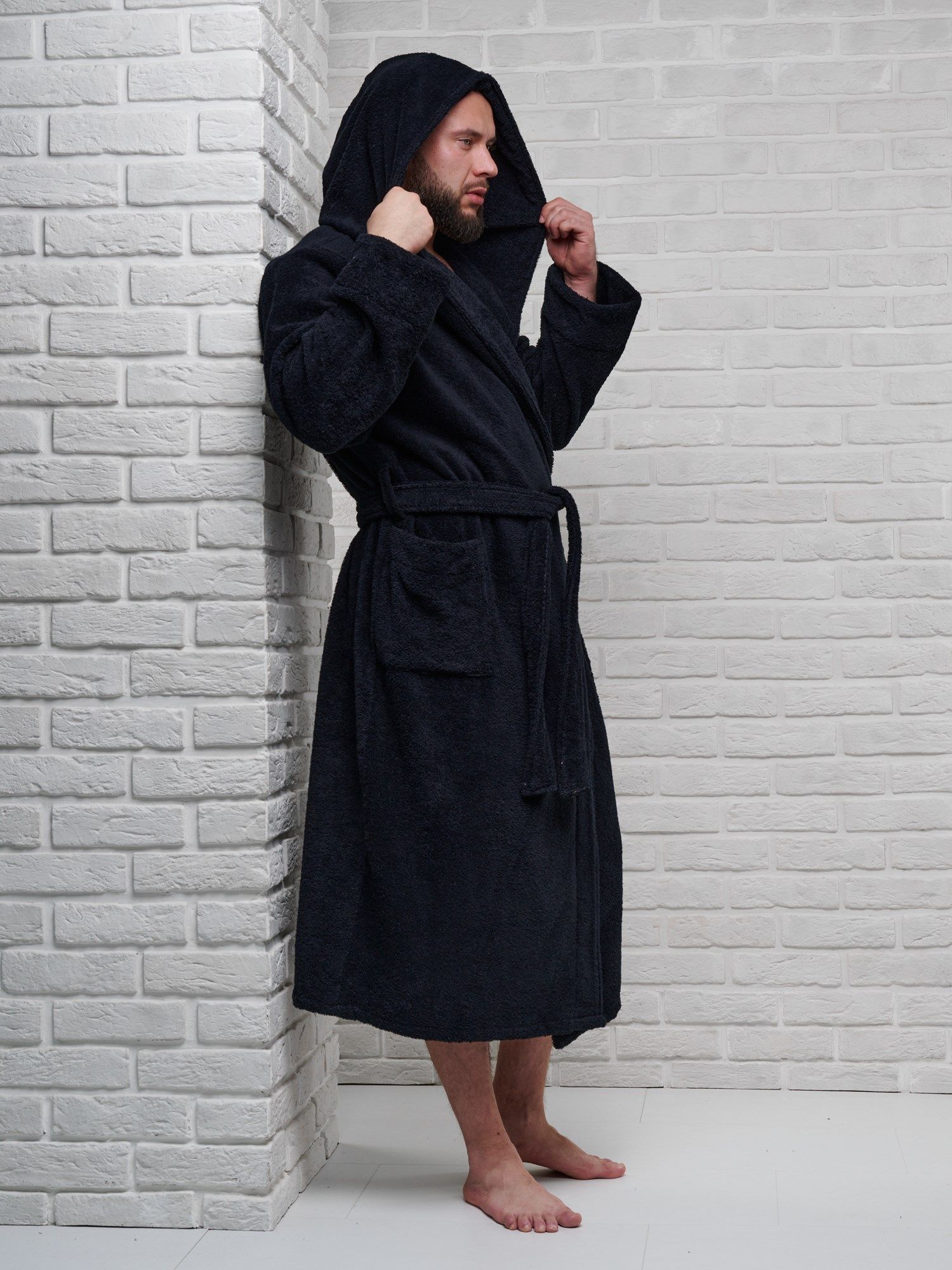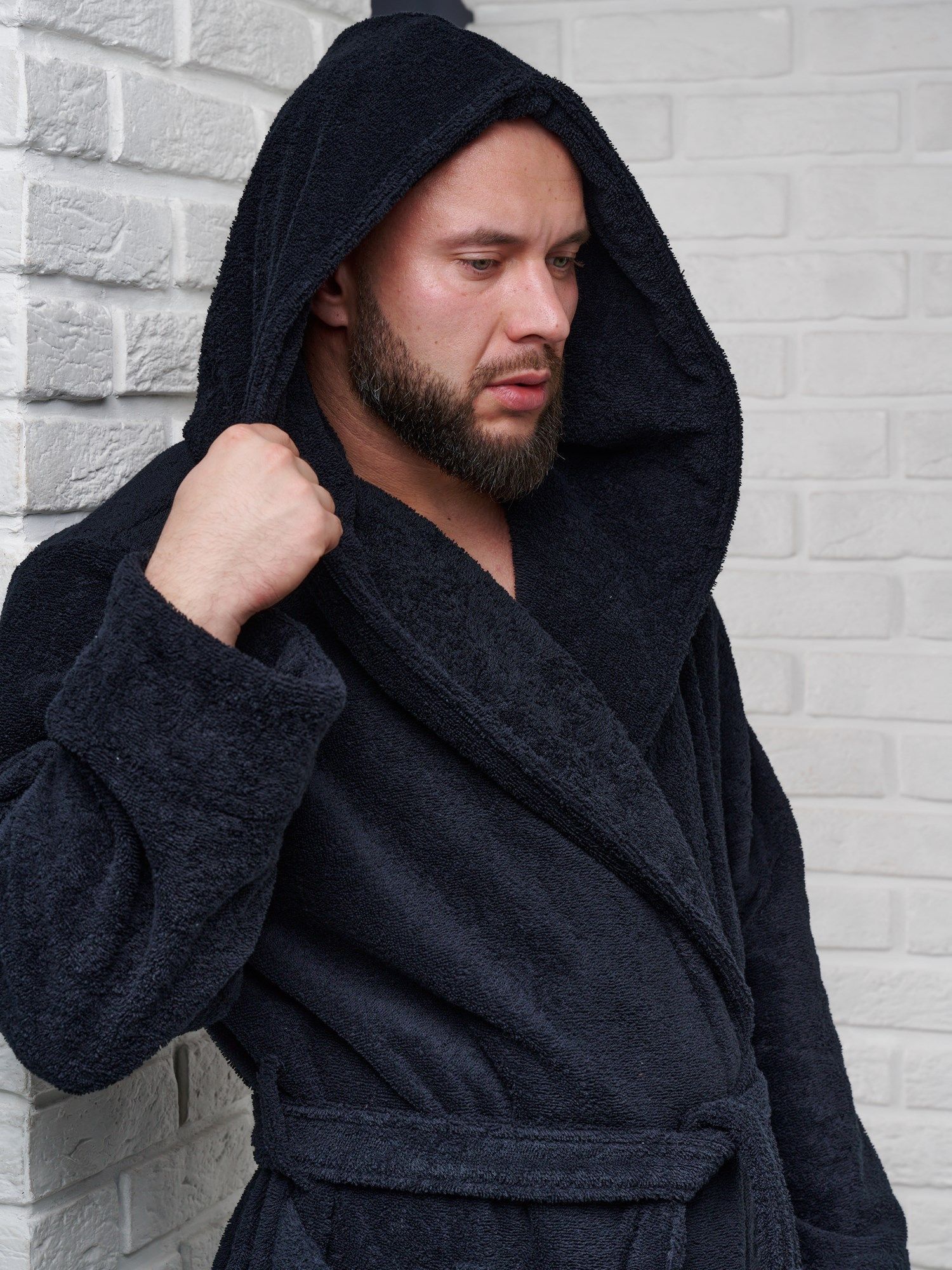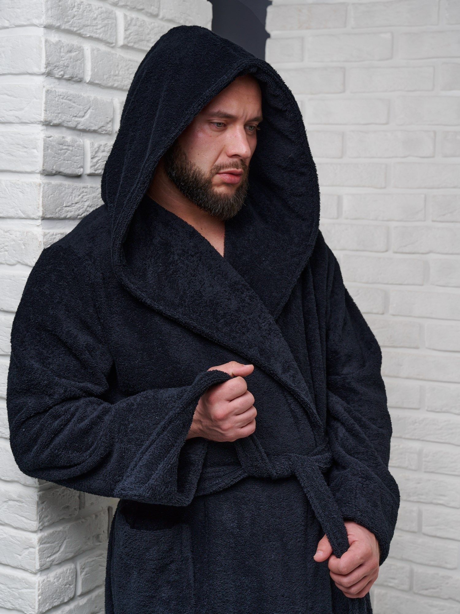 Халат мужской махровый PandaHug с капюшоном, черный