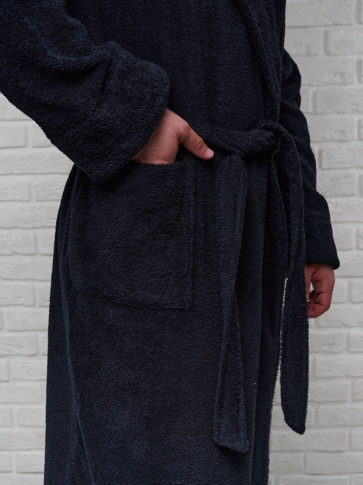 Модель халата с поясом позволяет ему быть универсальным и подходит к любому типу телосложения, скрывая недостатки и подчеркивая достоинства фигуры. Наличие карманов делает его практичным для ношения дома, в бане или сауне, а также на отдыхе.