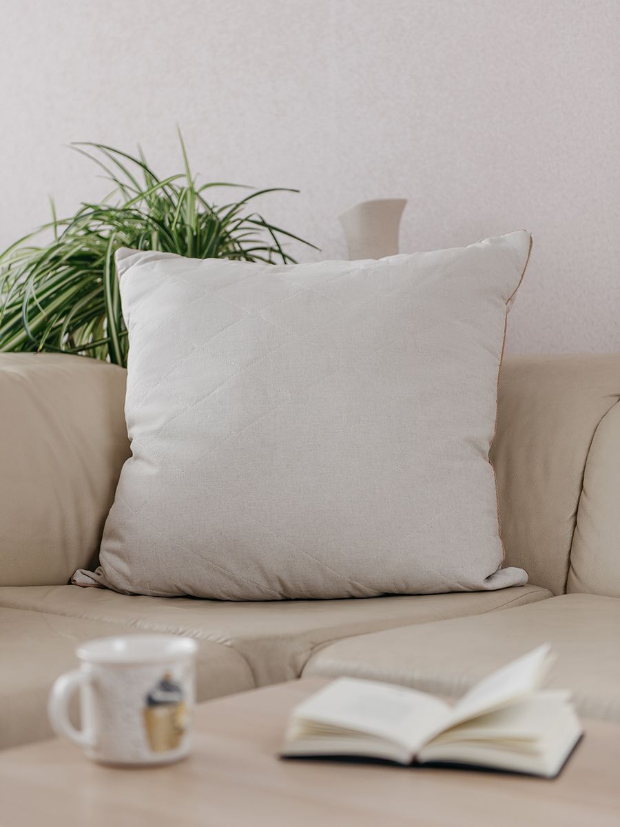 Льняной чехол подушки простеган верблюжьей шерстью, которая обладает хорошими разогревающими свойствами. Поэтому подушка очень теплая и целебная.