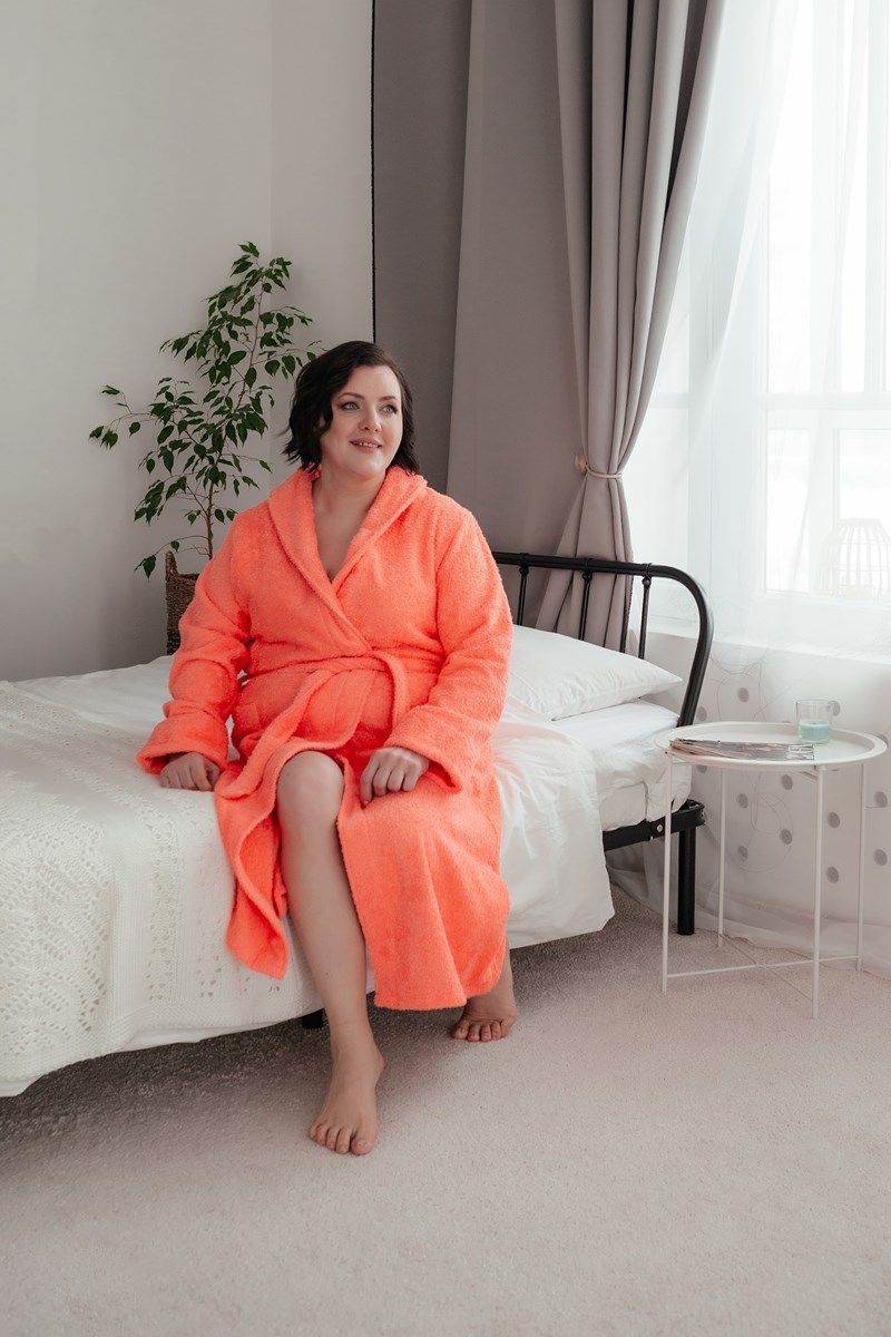 Женский коралловый махровый халат с воротником шалька,изготовлен из 100% хлопка, выращенного в экологически чистых регионах.