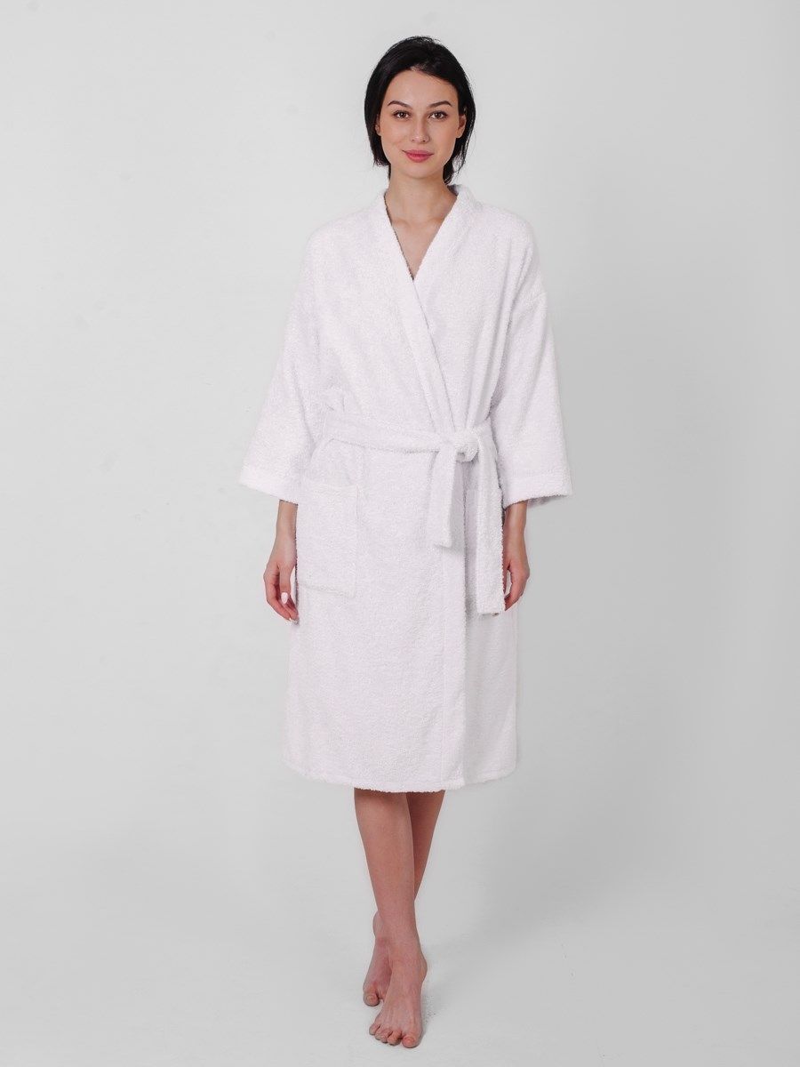 Женский белый махровый халат с воротником шалька,изготовлен из 100% хлопка, выращенного в экологически чистых регионах.